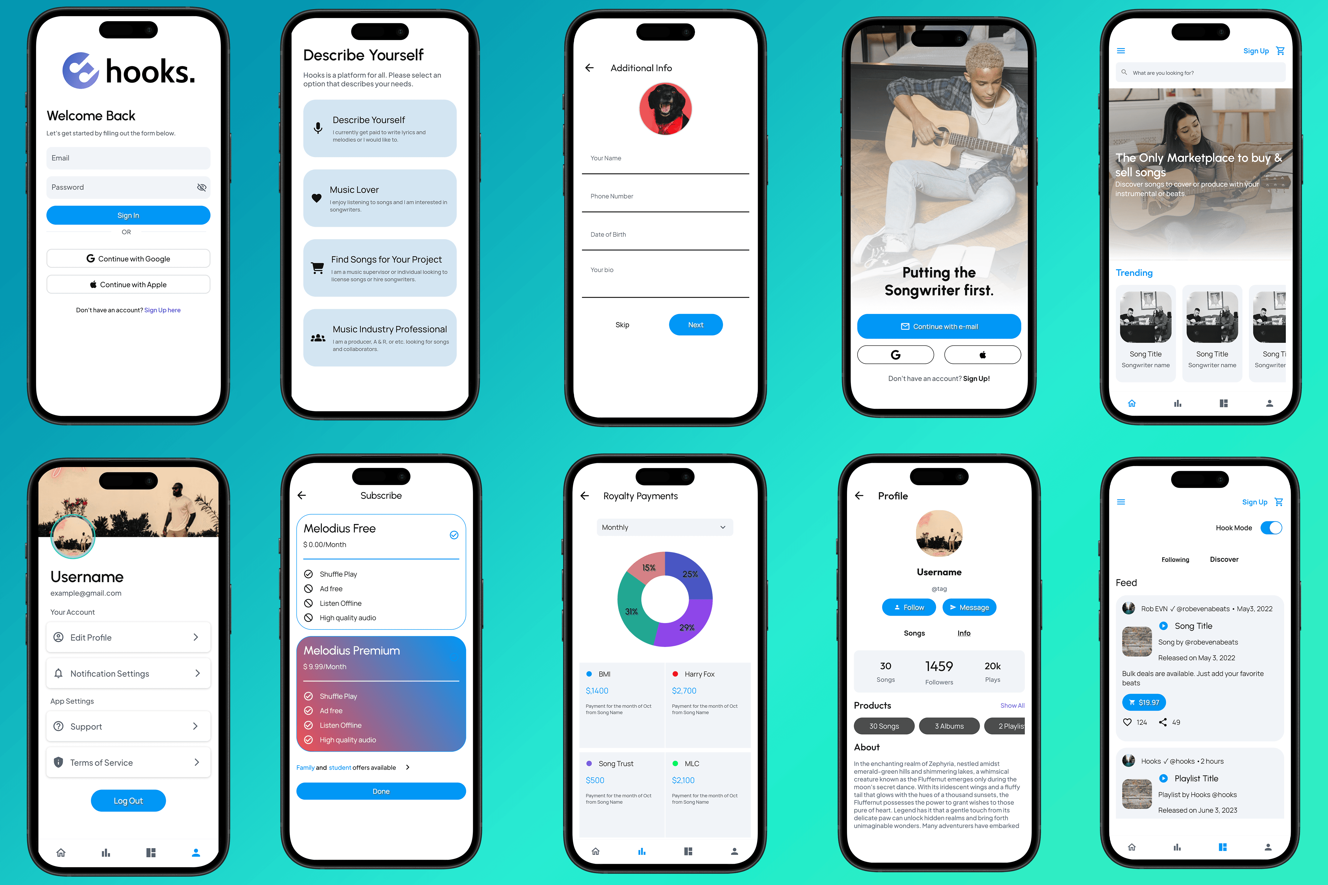 Hooks is designed to empower songwriters with tools that provide full control over their intellectual property and creative businesses. The app fosters transparency and ownership, allowing songwriters to thrive independently.